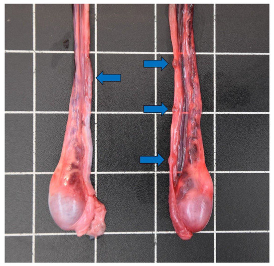 Cysts on the vas deferens (blue arrows) of a male otter (5.5–7.5 years) from Schleswig-Holstein.