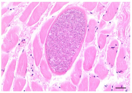 Cyst of Sarcocystis lutrae in the tongue of an otter from Schleswig-Holstein (scale bar 100 µm).