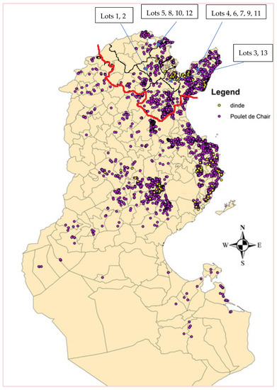 The poultry industry is of particular importance to many African countries in terms of meat supply, social plan (cheapest meat) and as a means of filling the deficits of other proteins [16]. Tunisian poultry farming has been experiencing remarkable development since the 1980s. Standard broilers are the main supplier of white meats. In 2020, the production of broiler meat reached nearly 132,000 tonnes, i.e., around 63% of the poultry meat, with an increase rate of 13.6% compared to 2012. Broilers are mainly produced by small-scale farmers, with 78% of farms having a capacity under 10,000 chickens per rotation, according to the last statistics (2015–2016) of the official Tunisian veterinary services and the Groupement interprofessionnel des produits avicoles et cunicoles [39]. However, the increase in the prices of raw materials is orienting production towards large integrated groups. In this context, backyard poultry consists of small flocks of different poultry species reared under traditional conditions. Free-range chicken farmers obtain day-old chicks from different farms from those that supply industrial farms or sometimes from informal circuits. Although backyard poultry represents an important socio-economic activity in rural areas of Tunisia, productivity in backyard flocks is often unsatisfactory because of serious health problems, malnutrition and poor management conditions.