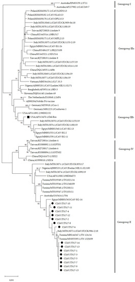 Unlike the highly conserved VP2 and VP3 gene sequences, VP1 shows a hypervariable region spanning from residues 139 to 151. Certain amino acid exchanges could influence the rate of virus replication and the spread of CIAV strains in the cell culture [9]. Therefore, VP1 is generally used for genetic characterisation and molecular studies of CIAV. Phylogenetic analysis has been performed on the CIAV VP1 gene or CIAV complete genome, allowing to recognise different genogroups [10,11,12,13,14], although an unambiguous classification has not yet been adopted.