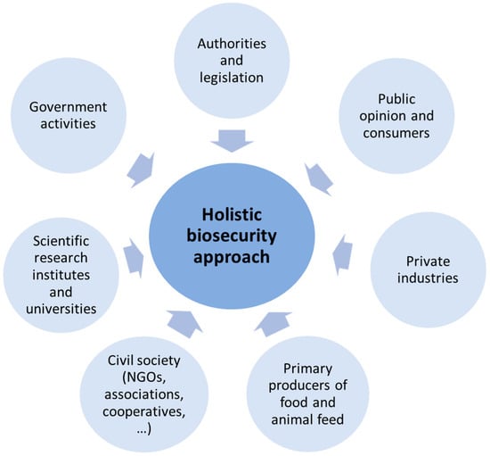 Biosecurity includes all measures to prevent the introduction of pathogens (bio-exclusion) and reduce the spread of pathogens (bio-containment) [17]. As part of the One Health concept, biosecurity is particularly important as it includes the prevention of the spread to humans, animals, plants and the environment. It is therefore a holistic and integrated approach, which considers the interactions among different stakeholders and sectors, as presented in Figure 2. A stringent biosecurity level, therefore, minimises the impact of infectious diseases on public, animal and plant health, as well as the economy, the environment and society in general. The FAO and WHO definition of biosecurity, which includes these aspects, is therefore appropriate and should be considered by the other actors as a reference to emphasise the importance of biosecurity, not only for animal health but also for public and environmental health.