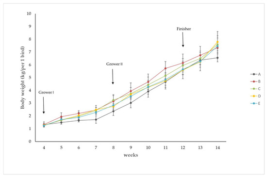The birds fed with a standard diet and corn silage showed a lower body weight in comparison to the other groups. This lower BW was maintained up to the 11th week of growth. During the next 3 weeks of fattening, BW in this group was comparable with the BWs in group C, D, and E. However, during the last week of the experiment, a marked (p ≤ 0.05) decrease in BW was noticed in comparison to all other groups of birds (Figure 1 and Table 4). Compared to group A, the addition of anionic salt (CaCl2) in its lower dose 240 g/100 kg diet led to a significant increase in BW, which continuously increased from the 9th to the 11th week of growth. During the 12th and 13th weeks of fattening, BWs in this group was also higher than BWs in group A but without statistical significance. As shown in Figure 2, in this experimental group, BW was positively correlated with DCAD, and values reached a high correlation coefficient of r = 0.84.