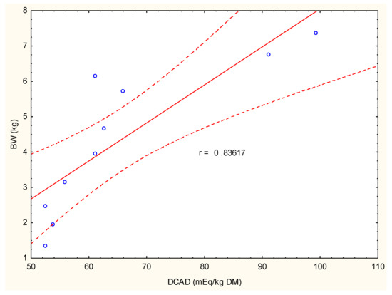 High positive correlation (r = 0.830) between BW and DCAD value in the group of birds fed the standard diet (60%), corn silage (40%) plus 240 g of CaCl2 per 100 kg of diet (i.e., group B). Estimation was performed with Statistica 13 (StatSoft, Poland) using linear Pearson matrix correlation analysis.