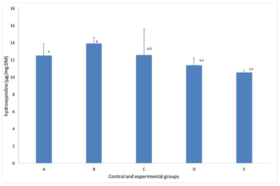 Bone hydroxyproline concentration in the control and experimental groups. Values are the mean ± SD. (a, b, c) Values in rows with different letters differ significantly (p ≤ 0.05; Tukey’s HSD test).