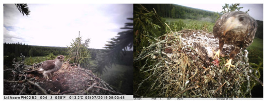 In the years 2018–2020, five cases (18.5%) of total failure were found at nests monitored by cameras. Three of them were caused by predation on chicks, and the other two were the result of nonembryonic eggs or death of the embryos during incubation. In 2019, we recorded two cases of brood loss caused by Northern Goshawk predation. In 2020, we found the first documented case of predation by White-tailed Eagle (Haliaeetus albicilla) on the Osprey chicks in history (Figure 1, Table S1). In the two cases of egg failure, we observed secondary predation by Pine Marten (Martes martes) in one nest in 2019 and by Great Spotted Woodpecker (Dendrocopos major) and Eurasian Jay (Garrulus glandarius) in a second nest in 2020 (Table S1).