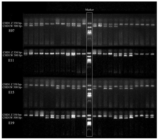 The sex of chicken embryo was identified by gel electrophoresis of DNA. DNA was extracted from yolk sac using TIANamp Genomic DNA Kit (TIANGEN, cat#DP304) following the manufacturer’s instructions. The concentration and quality of isolated DNAs were assessed by Nano Drop spectrophotometer (Thermo Fisher Scientific, Waltham, MA, USA). Subsequently, the CHD1 gene was amplified by polymerase chain reaction (PCR) with 0.1 µg DNA and primer pair SF/SR (SF: 5′-AGTGCATTGCAGAAGCAATATT-3′, SR: 5′-GCCTCCTGTTTATTATAGAATTCAT-3′) [14]. The chromosome of female chicken is ZW and that of male chicken is ZZ [15]; 500 bp (CHD1-W) and 350 bp (CHD1-Z) CHD1 gene fragments were amplified from the W-chromosome and Z-chromosome specific CHD1 gene, respectively. Then, the PCR products were run on 1.5% agarose gel by electrophoresis. Two bands indicated the female, and one single band stood for the male (Figure 1).