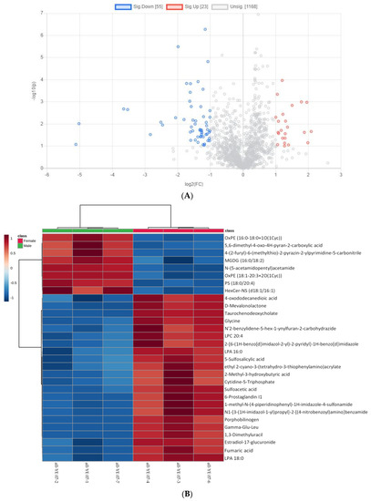 Differential yolk metabolites identified from male and female chicken embryos at E19 (n = 3). (A) The volcano plot shows the combination of the fold changes and the p values of each metabolite. The red dots represent the metabolites that were significantly upregulated in female birds, while the blue dots represent the metabolites that were significantly downregulated in female birds. (B) Heatmap showing the difference profile of yolk metabolites between male and female chicken embryos. Each cell in the plot corresponds to a normalized z-score value. Sample names are in columns and compound names are in rows.