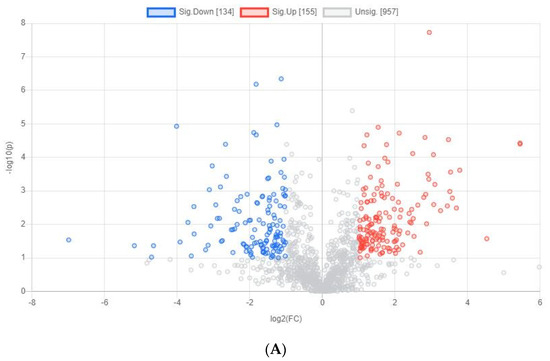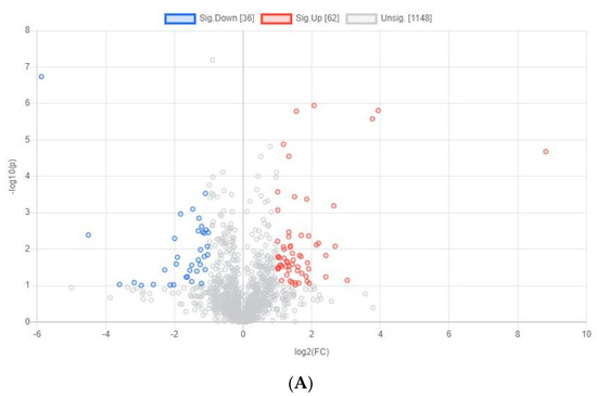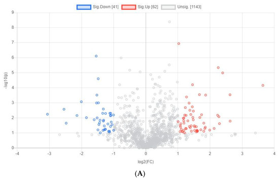 The raw data files generated by UHPLC–MS/MS were processed using the Compound Discoverer 3.1 (CD3.1, Thermo Fisher) to perform peak alignment, peak picking, and quantitation for each metabolite. The main parameters were set as follows: retention time tolerance, 0.2 min; actual mass tolerance, 5 ppm; signal intensity tolerance, 30%; signal/noise ratio, 3; and minimum intensity, 100,000. Next, the peak intensities were normalized to the total spectral intensity. The normalized data were used to predict the molecular formula based on additive ions, molecular ion peaks and fragment ions. Peaks were then matched with the mzCloud, https://www.mzcloud.org (accessed on 1 September 2021), mzVault, and MassList database to obtain the accurate qualitative and relative quantitative results [17]. Statistical analyses were performed by R (R version R-3.4.3), Python (Python 2.7.6 version), and CentOS (CentOS release 6.6). When the data were not normally distributed, Log2 normal transformation was attempted.