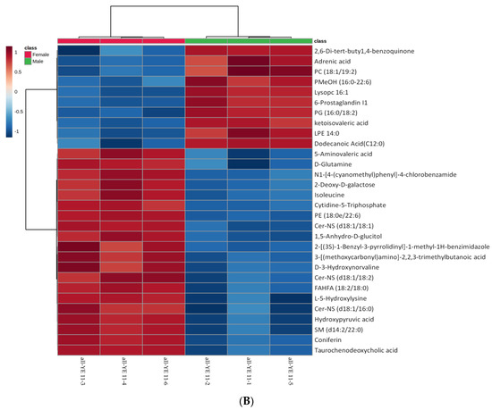 The same analysis for yolk metabolites of male and female chicken embryos at E11 was performed. The results show that a total of 103 significantly different metabolites were identified (Figure 3A). The top 10 significantly different metabolites were mainly lipids, especially glycerophospholipids (PE, PMeOH, and PG) and Sphingolipid (Cer-NS and SM); Coniferin, L-Dopa, and Cysteine-glutathione-disulfide were also identified (Table 3). According to the heatmap results at E11 (Figure 3B), the yolk metabolites downregulated in female chicken embryos but upregulated in male chicken embryos were mainly related to the pathways of pyrimidine metabolism (PC (18:1/19:2)), fatty acid biosynthesis (Adrenic acid, Dodecanoic Acid (C12:0)), and purine metabolism (PG (16:0/18:2)). Conversely, the yolk metabolites that upregulated in female chicken embryos but downregulated in male chicken embryos were mainly related to pathways of D-glutamine and D-glutamate metabolism (D-Glutamine), valine, leucine and isoleucine biosynthesis (Isoleucine), and lysine degradation (L-5-Hydroxylysine).