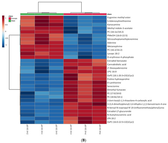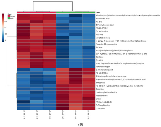 Differential yolk metabolites identified from male and female chicken embryos at E15 (n = 3). (A) The volcano plot shows the combination of the fold changes and the p values of each metabolite. The red dots represent the metabolites that were significantly upregulated in female birds, while the blue dots represent the metabolites that were significantly downregulated in female birds. (B) Heatmap showing the difference profile of yolk metabolites between male and female chicken embryos. Each cell in the plot corresponds to a normalized z-score value. Sample names are in columns and compound names are in rows.
