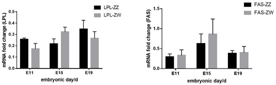 In order to understand the sexual effect on the lipid-related gene expression during the embryogenesis, we analyzed the expression of LPL and FAS in chicken embryo livers at different embryonic days (Figure 6). However, the results showed that there was no significant difference in the expression of LPL and FAS in livers between male and female birds at different embryonic stages.