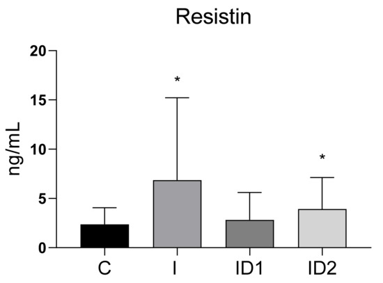 Plasma resistin concentration (ng/mL) in the different groups. Control group (C) n = 14, inflammatory group (I) n = 21, mild insulin dysregulation group (ID1) n = 18, severe insulin dysregulation group (ID2) n = 19. Bars represent mean + SD. Asterisks indicate significant differences with the control group (* p < 0.05).
