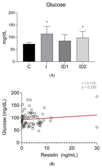 (A) Plasma glucose concentration (mg/dL) in the different groups. Control group (C) n = 14, inflammatory group (I) n = 21, mild insulin dysregulation group (ID1) n = 18, severe insulin dysregulation group (ID2) n = 19. Bars represent mean + SD. Asterisks indicate significant differences with the control group (* p < 0.05). (B) Correlation between plasma glucose concentration (mg/dL) and plasma resistin concentration (ng/mL) in 72 horses. The linear regression line is draw red solid (n = 72, r = 0.119, p = 0.320).