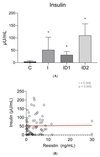 Plasma insulin concentrations were higher in both groups of insulin dysregulation horses, ID1: 31.16 ± 13.71 µU/mL (p = 0.046), and ID2: 109.73 ± 47.04 µU/mL (p < 0.001), than in control horses, 3.96 ± 4.66 µU/mL. Horses with inflammatory conditions also showed increased insulin concentrations, 51.45 ± 51.24 µU/mL (p < 0.001), (Figure 3A). No significant correlation was found between plasma insulin concentrations and plasma resistin levels (r = 0.008; p = 0.949) (Figure 3B).