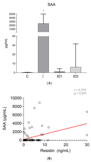 Concentrations of serum amyloid A (SAA) were very low in control horses, 0.41 ± 0.05 µg/mL. By contrast, horses with inflammatory diseases had extremely high SAA concentrations in plasma, 2518.35 ± 2525.65 µg/mL (p < 0.001). Horses with severe insulin dysregulation also had higher SAA, 6.23 ± 25.37 µg/mL than control horses, but those differences were not significant (p = 0.555). Horses with mild insulin dysregulation did not have increased SAA, 1.20 ± 3.20 µg/mL (Figure 4A). Significant weak positive correlation was found between plasma SAA concentrations and plasma resistin levels (r = 0.372; p = 0.001) (Figure 4B).