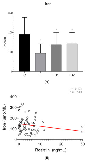 (A) Plasma iron concentration (µmol/dL) in the different groups. Control group (C) n = 14, inflammatory group (I) n = 21, mild insulin dysregulation group (ID1) n = 18, severe insulin dysregulation group (ID2) n = 19. Bars represent mean + SD. Asterisks indicate significant differences with the control group (* p < 0.05). (B) Correlation between plasma iron concentration (µmol/dL) and plasma resistin concentration (ng/mL) in 72 horses. The linear regression line is draw red solid (n = 72, r = 0.174, p = 0.143).