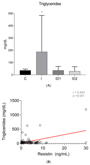 The concentration of plasma triglycerides was significantly higher in horses with inflammatory diseases, 187.61 ± 296.44 mg/dL, when compared with controls, 36.27 ± 10.79 mg/dL (p = 0.009). Insulin dysregulation did not influence plasma triglycerides, 36.09 ± 32.10 and 29.17 ± 36.99 mg/dL, in ID1 and ID2, respectively (Figure 6A). A significant average positive correlation was found between plasma triglycerides concentrations and plasma resistin levels (r = 0.442; p < 0.001) (Figure 6B).