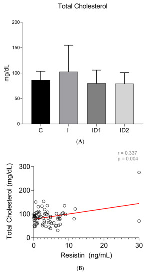 (A) Plasma total cholesterol concentration (mg/dL) in the different groups. Control group (C) n = 14, inflammatory group (I) n = 21, mild insulin resistance group (ID1) n = 18, severe insulin resistance group (ID2) n = 19. Bars represent mean + SD. (B) Correlation between plasma total cholesterol concentration (mg/dL) and plasma resistin concentration (ng/mL) in 72 horses. The linear regression line is draw red solid (n = 72, r = 0.337, p = 0.004).