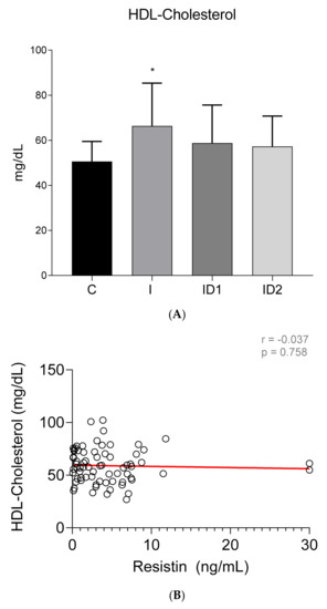 (A) Plasma HDL cholesterol concentration (mg/dL) in the different groups. Control group (C) n = 14, inflammatory group (I) n = 21, mild insulin dysregulation group (ID1) n = 18, severe insulin resistance group (ID2) n = 19. Bars represent mean + SD. Asterisks indicate significant differences with the control group (* p < 0.05). (B) Correlation between plasma HDL cholesterol concentration (mg/dL) and plasma resistin concentration (ng/mL) in 72 horses. The linear regression line is draw red solid (n = 72, r = 0.037, p = 0.758).