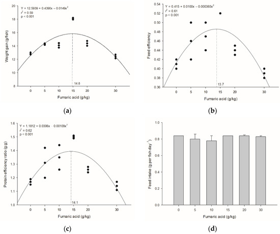 The survival rate during the trial was 100%, and all experimental diets were well accepted by the fish. The dietary fumaric acid level for maximum weight gain (Figure 1a), feed efficiency (Figure 1b), and the protein efficiency ratio (Figure 1c) of Nile tilapia juveniles was estimated to be approximately 14–15 g/kg. Feed intake in fish was similar (p > 0.05) regardless of fumaric acid levels in the diets (Figure 1d).