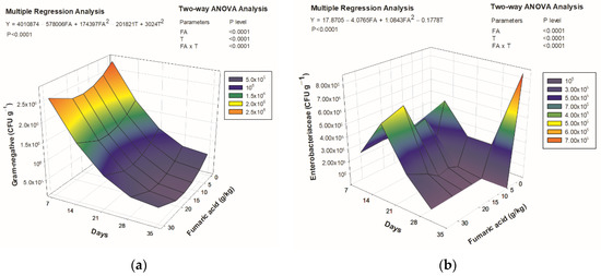 Relationship between bacteria counts in the gut of Nile tilapia juveniles and dietary fumaric acid levels through 35 days: (a) Gram negative bacteria; (b) Enterobacteriaceae. FA: fumaric acid level (g/kg); T: time (days).