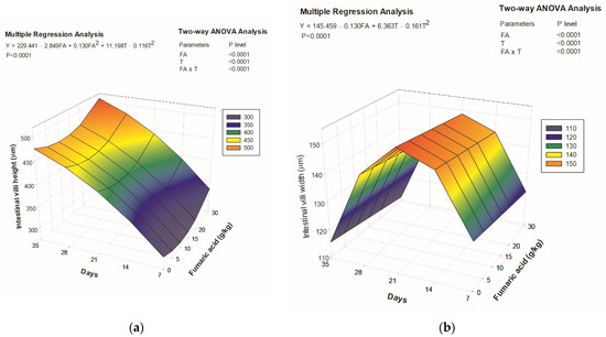 Relationship between intestinal villi morphometry of Nile tilapia juveniles and dietary fumaric acid levels through 35 days: (a) intestinal villi height; (b) intestinal villi width. FA: fumaric acid level (g/kg); T: time (days).