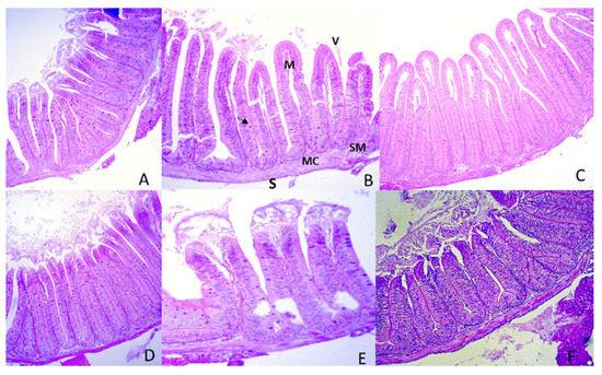 Photomicrograph of proximal intestine of Nile tilapia juveniles fed diets supplemented with fumaric acid levels of 0 g/kg (A), 5 g/kg (B), 10 g/kg (C), 15 g/kg (D), 20 g/kg (E) and 30 g/kg (F). In B, villi (V), mucosal epithelium (M), submucosa layer (SM), muscular layer (MC), serous layer (S) and goblet cell (arrow). HE staining. Bar = 200 µm.