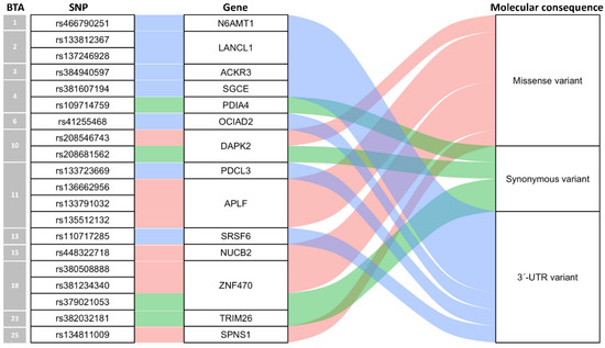 From variants calling for the parents’ resequencing data, a total of 5,898,127 SNPs were identified, of which 96,139 SNPs (1.63%) were assigned to gene coordinates. To obtain heterozygous exonic SNPs in offspring, we screened SNPs in which sire and dam were homozygous with opposite alleles. A total of 3801 SNPs remained, which were within 1569 annotated bovine genes. Using variant calling for all transcriptome data of six tissues from the offspring, the expressed alleles at these SNP loci were determined and used in the identification of allele-specific expression patterns and parental origin of the expressed alleles. Figure 1 shows 20 SNPs with MAE in at least 1 tissue of offspring in which 8 were missense variants, 4 were synonymous variants, and 8 were 3’-UTR variants. These SNPs were assigned to 14 genes located across 12 different chromosomes.