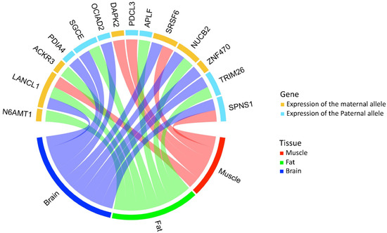 Figure 2 shows a tissue-specific MAE status of genes and the parental origin of their expressed allele. The number of genes in which maternal alleles were expressed and the number of genes in which paternal alleles were expressed were both seven. Only LanC like 1 (LANCL1), whose maternal allele was expressed, showed MAEs across all three tissues, and the MAE status of the other genes varied depending on the tissue. There were two muscle specific MAE genes: death associated protein kinase 2 (DAPK2) and phosducin like 3 (PDCL3); three fat specific MAE genes: N-6 adenine-specific DNA methyltransferase 1 (N6AMT1), atypical chemokine receptor 3 (ACKR3), aprataxin and PNKP like factor (APLF); and three brain-specific MAE genes: protein disulfide isomerase family A member 4 (PDIA4), OCIA domain containing 2 (OCIAD2), and ZNF470. The remaining five genes showed MAEs in two types of tissues.