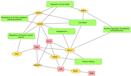 The network based on the enriched biological processes and associated traits for MAE genes. The node in yellow indicates genes whose shapes of diamonds and circles represent their expressed alleles maternally or paternally, respectively. The rectangles in green and red indicate the enriched biological processes and the associated traits, respectively.