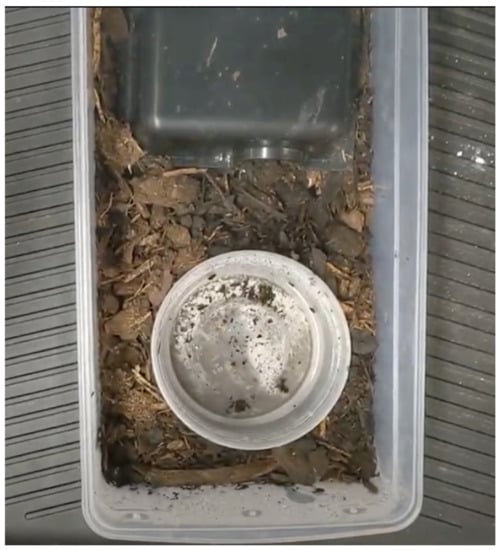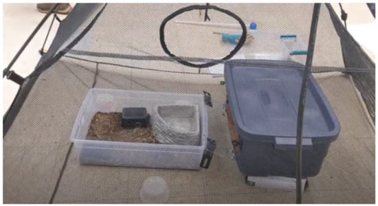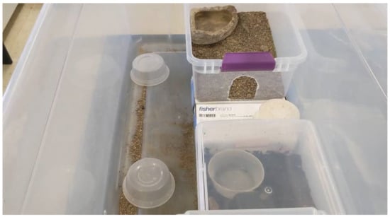 The initial training environment is displayed here. The training environment contains the first shift tub, three deli cups, and a snake’s primary enclosure. Glove boxes were used to make the entrance of the shift tub approximately the same height as the primary enclosure. The shift tub contains a substrate mixture and water bowl.