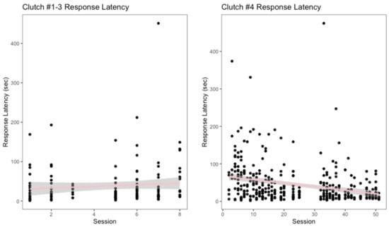 Response latency, measured in seconds, as the training sessions progressed is displayed above.