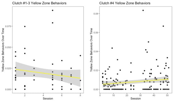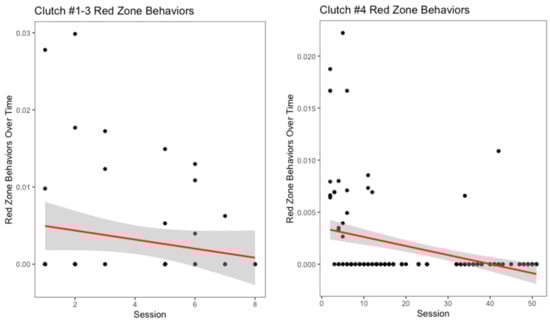 There appeared to be a slight decrease in yellow zone behaviors over number of training sessions for the oldest three clutches (Figure 5), though it was not significant (r2 = 0.008, p = 0.24). Interestingly, for clutch #4, this measurement increased over the progression of the training sessions (Figure 5). However, this increase was not significant (r2 = 0.01, p = 0.07). Across all clutches, hooding was the most common yellow zone behavior displayed. Both the oldest three clutches and clutch #4 displayed decreases in red zone behaviors over the number of training sessions (Figure 6). For the oldest three clutches, this change was not significant (r2 = 0.02, p = 0.14). In contrast, the decrease in this measurement for clutch #4 was significant (r2 = 0.14, p < 0.001). With the exception of the youngest and oldest clutch, each clutch had a different modal red zone behavior. Clutches #1 and #4 both hid when experiencing severe stress, while clutch #3 displayed body flattening most often. In response to severe stress, the most common red zone behavior performed by clutch #2 was an attempt to bite the trainer; this was the only clutch to do this behavior.