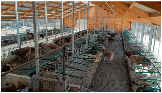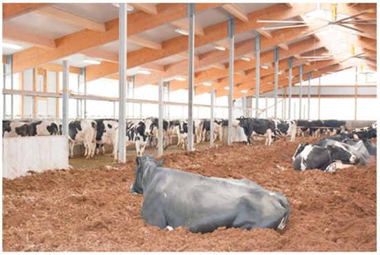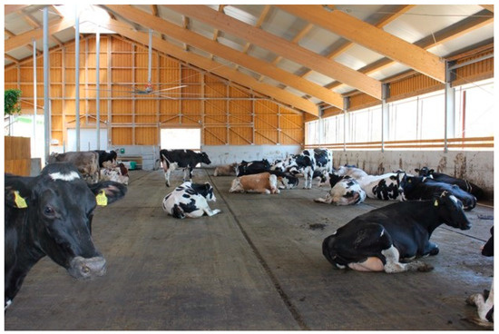 In recent years, a few alternative housing systems for dairy cattle have emerged, generating discussion among the professional and lay public and the media. Alongside common housing systems like the tie-stall (Figure 1) and the cubicle (also called free stall) (Figure 2), alternative free walk housing systems, i.e., compost-bedded pack (Figure 3) and artificial floor systems (Figure 4), are growing in popularity not only in the countries where they were initially developed such as Israel and the USA but also with some modification in Europe and less developed dairy countries like Slovenia [1,2,3,4,5,6]. Available data indicate that free walk housing systems increase cow welfare by providing more space and allowing animals to rest without being restricted by cubicle partitions as occurs with tie-stalls and cubicle housing systems [1,2,3,7].