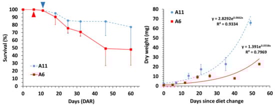 Survival (%) and dry weight (mg) in Hippocampus reidi juveniles fed on dietary schedules A6 and A11. Data are provided as means (two batches per diet) and standard deviations (vertical bars). Triangles: dietary shift (from copepods to Artemia nauplii) in A6 and A11.