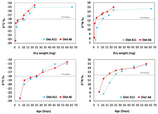 Isotopic (δ13C and δ15N) changes in seahorse Hippocampus reidi juveniles fed A6 and A11 diets. Data are provided as means for dry weight (mg; upper) and age (days; bellow). For clarity, sd values are not provided. Diet: nauplii of Artemia (dashed lines; −18.0‰ δ13C; 12.3‰ δ15N).