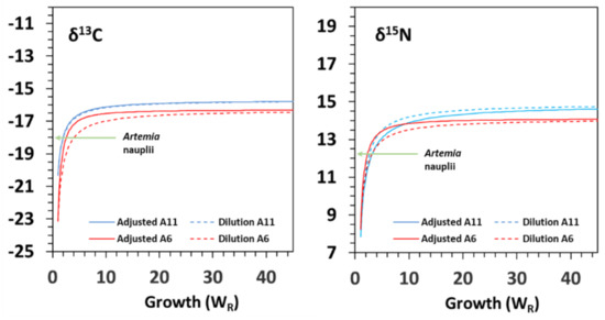 Model G–Relationships of changes in δ13C and δ15N (‰) as functions of the relative mass increase in seahorse Hippocampus reidi juveniles fed on diets A6 and A11. The curves refer to the feeding period on Artemia (6–60 DAR in diet A6 and 11–60 DAR in diet A11). Diet: Artemia nauplii (−18.03‰ δ13C; 12.27‰ δ15N). Dashed lines represent the dilution models.