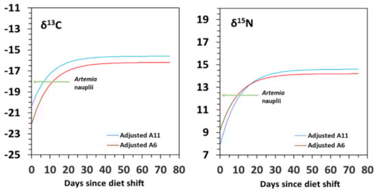 The isotopic equilibrium was reached before the end of the experiment period in all cases, except for δ13C in diet A11–model G (about 85.4 days). Compared to diet A6, the equilibrium estimates (δeq) were lower in juveniles from diet A11, likely due to differences in initial diet–tissue isotopic values at diet shift (see Figure 2). Even though there is a broad variation of turnovers rates in fish larvae and juveniles, it has been suggested that tissues are in equilibrium with the diet after four to five half-lives [22,59,60], which agrees with our results (see D50 vs. D95 in Table 2).