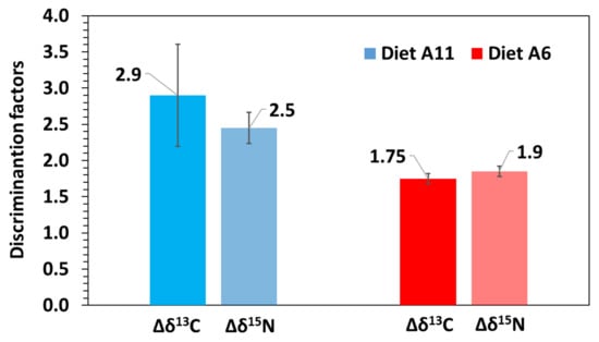 Except for δ13C in model G–diet A11, the discrimination factors resulting from models D and G were rather similar for each isotope, ranging from 1.7‰ to 2.4‰ for δ13C and from 1.8‰ to 2.3‰ for δ15N (Table 2). The discrimination factor estimated for δ13C in model G–diet A11 (3.4‰) was overestimated compared to the other estimates (2.3–2.6‰). Average discrimination factors considering both fitting models were 1.8 ± 0.1‰ for δ13C and 1.9 ± 0.1‰ for δ15N in diet A6, and 2.9 ± 0.7‰ for δ13C and 2.5 ± 0.2‰ for δ15N in diet A11 (Table 2; Figure 5).