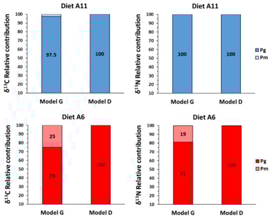 Considering the estimates from model D of the metabolic (Pm) and growth (Pg) contributions, the model revealed that there was not any contribution of δ13C and δ15N to metabolism both in diet A6 and A11 (Figure 6). These results partially agreed with those in model G, but the simple dilution model revealed moderate metabolic contributions of δ13C (25%) and δ15N (19%) in diet A6.