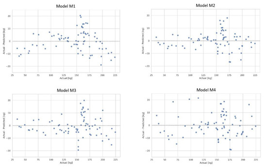 Graphs of the distribution of errors for the testing dataset (Figure 1) were produced for the four models referred to above (M1, M2, M3 and M4). The smallest differences between the actual and the estimated body weight were observed for the polynomial model M2, and they were no greater than 7.8 kg for horses weighing up to 150 kg. For horses weighing more than 150 kg, the maximum difference between the actual and the estimated body weight was 18.4 kg.