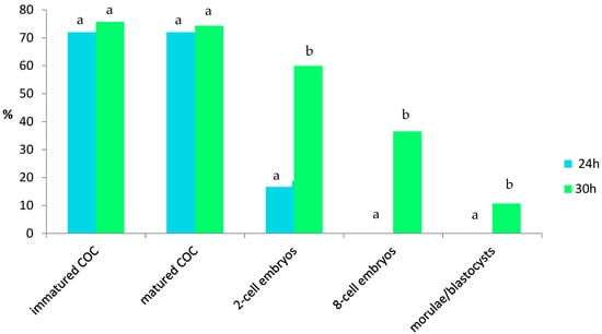 Analysis of percentages of in vitro maturation of oocytes and development of embryos, depending on the time of oocyte maturation (24 or 30 h). COC—cumulus-oocyte complex. Bars with different letters denote statistical differences at p < 0.01.