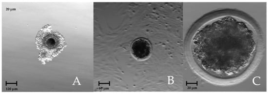 In this study, the efficiency of isolated COCs per donor (12.33 ± 0.5/12.50 ± 0.95) was similar to that for American bison [23,24,25,26,27,28]; however, analysis of COCs indicated that not all of them could qualify for maturation, which was associated with signs of degeneration (Table 1).