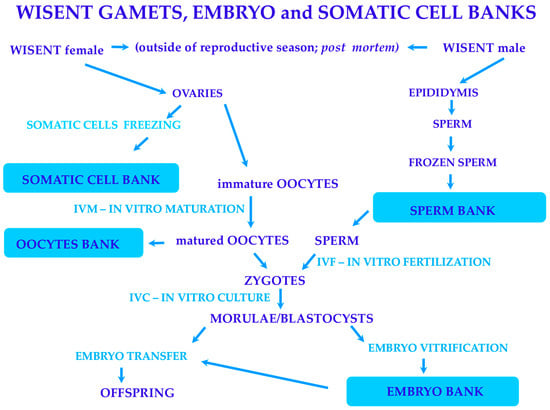 The cryopreservation of wisent germplasm: gametes, embryos, and somatic cells. Generally, wisent germplasm is collected postmortem from females and males culled out of the reproductive season (from October to March). Both ovaries and epididymis can be collected, and somatic cells from ovaries can be isolated, frozen, and deposited in a somatic cell bank. Sperm are isolated from the epididymis, frozen, and deposited in a sperm bank. Additionally, immature oocytes are recovered from isolated ovaries for in vitro maturation (IVM). Some of the matured oocytes are vitrified and deposited in an oocyte bank. At the same time, most of the matured oocytes are fertilized in vitro (IVF) using thawed sperm taken from the sperm bank. In the next step, the embryos received due to fertilization are cultured in vitro (IVC) until they achieve the morulae and blastocyst stages. Next, embryos are vitrified and banked in the embryo bank to transfer them to recipients and introduce offspring into the herds.