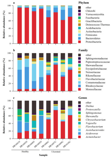 Composition of the skin microbiota of each Hoplobatrachus rugulosus sample collected to compare healthy and ulcerated skin at the (a) phylum, (b) family, and (c) genus levels. Different colors in the figures indicate different taxa and are labeled on right side of each figure. In each panel, “others” represents the sum of the relative abundance of all other phyla (a), families (b), and genera (c) not listed in the figure.