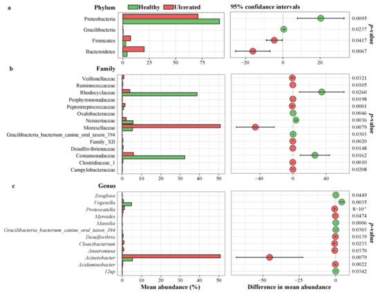 Significant difference analysis for different taxa at the (a) phylum, (b) families, and (c) genus levels between healthy and ulcerated Hoplobatrachus rugulosus skin.