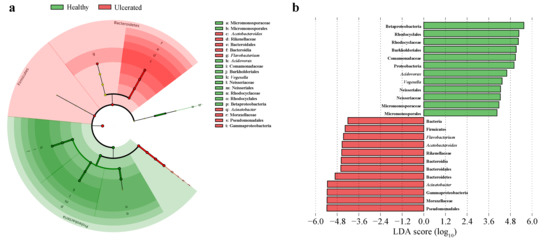 Linear discriminant analysis effect size (LEfSe) of bacterial composition on healthy and ulcerated Hoplobatrachus rugulosus skin (LDA > 4, p < 0.05). (a) Taxonomic representation of statistical and biological result reveals consistent differences between healthy and ulcerated H. rugulosus skin. Differences are represented using a colored circle; the color of circles represents their respective levels of classification, and the size of circles is proportional to the taxon abundance, representing the phylum, class, order, and family. (b) Histogram of the linear discriminant analysis (LDA) scores computed for features differentially abundant between healthy and ulcerated H. rugulosus skin. LEfSe scores can be interpreted as the degree of consistent difference in relative abundance of the analyzed bacterial communities between healthy and ulcerated groups.