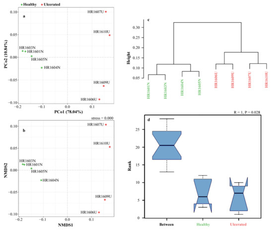 Beta diversity of skin microbiota in healthy and ulcerated groups of Hoplobatrachus rugulosus. Based on weighted UniFrac distance, (a) principal coordinate analysis (PCoA), (b) non-metric multidimensional scaling (NMDS), (c) unweighted pair-group method with arithmetic means (UPGMA), and (d) analysis of similarities (ANOSIM) were performed.