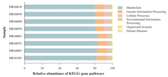 The PICRUSt functional prediction showed the abundance of the functional gene related to the KEGG pathways at different levels (1–3). A majority of the KEGG pathways enriched at level 1 were metabolism (81.1% ± 1.2%), genetic information processing (10.9% ± 0.5%), cellular processes (4.8% ± 1.4%), environmental information processing (2.5% ± 0.3%), organismal systems (0.4% ± 0.0%), and human disease (0.2% ± 0.1%) (Figure 5). The results of the Welch’s t-test revealed no statistical significance between the HG and UG in the abundance of genes related to the KEGG pathway level 1 (p > 0.05).