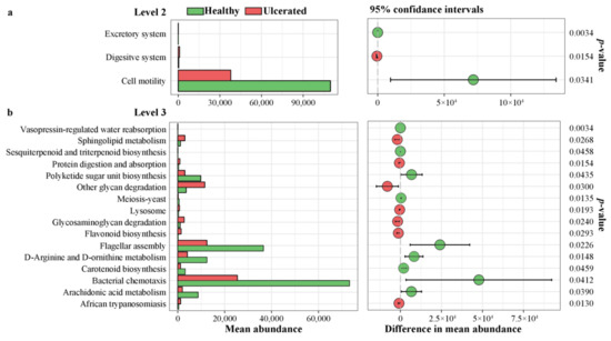 Significant difference analysis of functional classifications of 16s RNA in skin microbiota of Hoplobatrachus rugulosus at (a) level 2 and (b) level 3 between healthy and ulcerated skin.